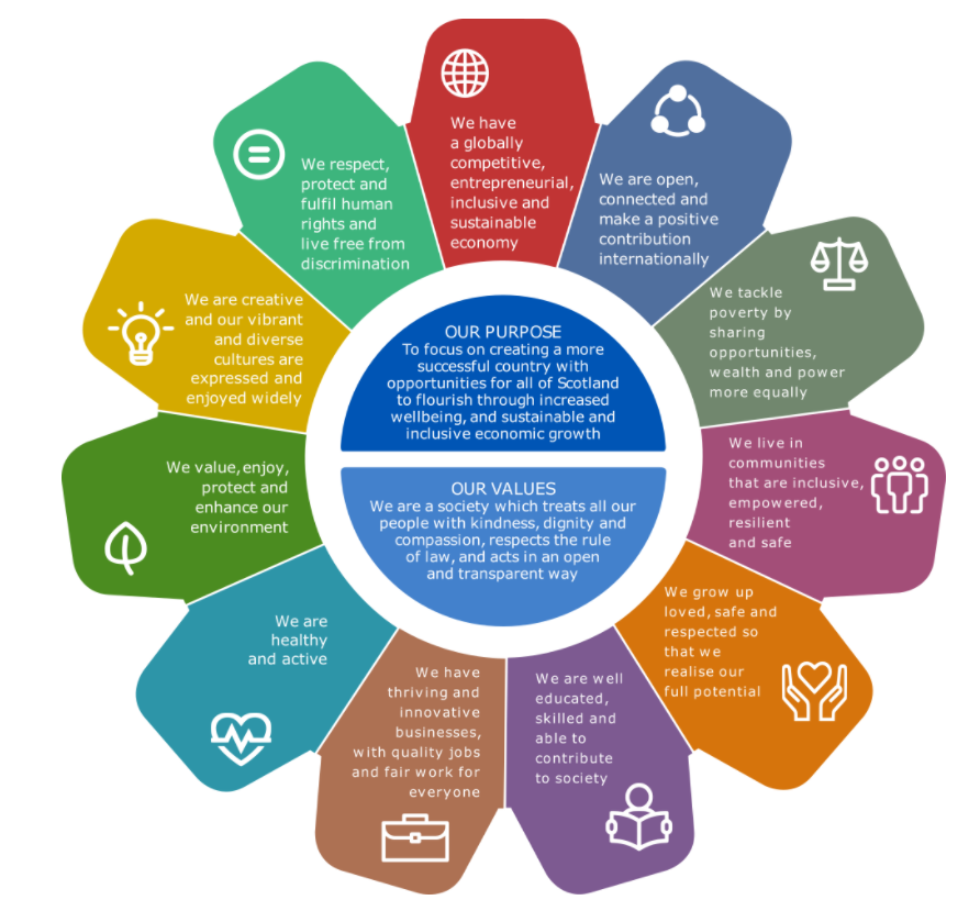 The Scottish Government’s National Performance Framework (NPF) is the key mechanism for benchmarking environmental, economic and social progress in Scotland. The NPF is intended to both guide policy making and ensure accountability.